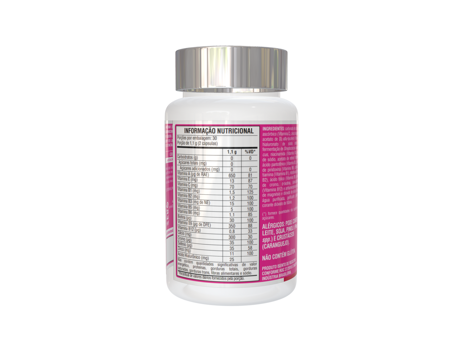 A Biotina, também conhecida como Vitamina B7, é uma das vitaminas mais reconhecidas quando o assunto é fortalecimento capilar e de unhas, contribuindo para a formação de queratina, uma proteína essencial para fios e unhas fortes. Já o Ácido Hialurônico, constitui um poderoso agente hidratante, que ajuda a pele a manter-se naturalmente hidratada e com uma aparência saudável e luminosa.